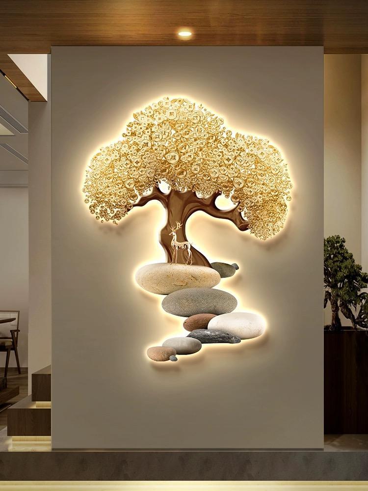 لوحة حائط فنية بإضاءة LED بتصميم شجرة ذهبية وأحجار متدرجة